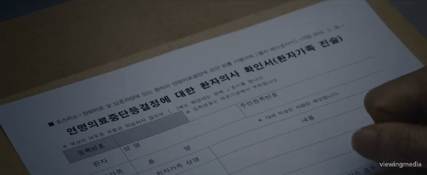 아버지의 상태가 다시 안정되었다는 말을 들은 선영은 연명치료 중단에 대해 묻는다. 담당 의사는 깨어날 확률은 낮지만 장기간 생존 가능성은 있다고 설명한다. 선영은 일회를 불러 연명치료 중단 신청서를 건넨다. 가족이 합의하면 중단이 가능하다고 말하며 결정을 맡긴다. 이후 장례를 계속 진행하기 위한 계획이 구체적으로 이어진다. 사망 진단서를 위조해 원무과에 제출하고 사망 확인서를 발급받는다. 장례식장에는 빈소만 차리고 실제 장례 절차는 최소화하는 방식으로 진행한다.