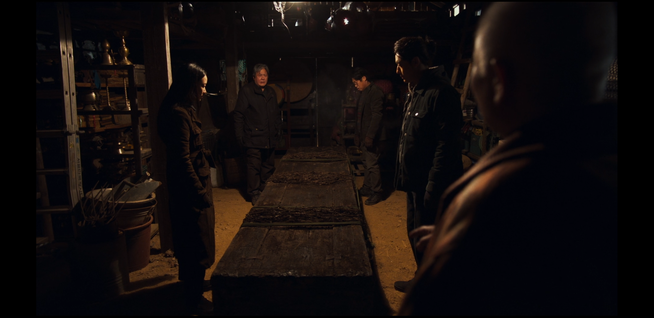 늦은 밤이 되어 관은 근처 절에 임시로 안치되고, 무당들은 결계를 친 뒤 하룻밤을 지낸다.